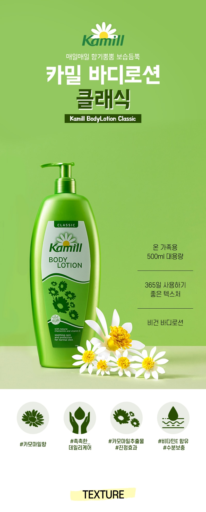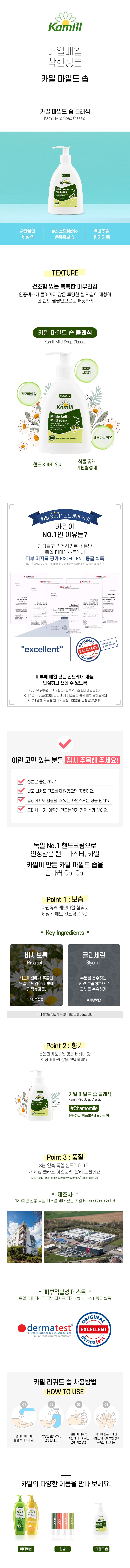 | 화장품법에 따라 기재.표시하여야 하는 모든성분 | 카밀 핸드크림 클래식 정제수, 에틸헥실스테아레이트, 글리세릴스테아레이트에스이, 글리세린, 하이드로제네이티드코코-글리세라이즈, 세테아릴알코올, 마트리카리아꽃추출물, 비사보롤, 락틱애씨드, 미리스틸알코올, 스테아릭애씨드, 팔미틱애씨드, 잔탄검, 벤질알코올, 페녹시에탄올, 프로필렌글라이콜, 카프릴릴글라이콜, 데실렌글라이콜, 향료, 헥실신남알, 리날룰, 부틸렌글라이콜, 리모넨, 시트로넬올, 알파-아이소메틸아이오논, 글루코오스, 시트랄, 소듐벤조에이트, 쿠마린, 제라니올, 포타슘솔베이트 카밀 마일드 솝 클래식 정제수, 소듐라우레스설페이트, 코카미도프로필베타인, 소듐클로라이드, 향료, 마트리카리아꽃추출물, 비사보롤, 글루코오스, 락틱애씨드, 코코-글루코사이드, 글리세릴올리에이트, 프로필렌글라이콜, 구아하이드록시프로필트라이모늄클로라이드, 부틸렌글라이콜, 시트릭애씨드, 포타슘솔베이트, 소듐벤조에이트 카밀 핸드로션 클래식 정제수, 에틸헥실스테아레이트, 글리세린, 글리세릴스테아레이트에스이, 세테아릴알코올, 하이드로제네이티드코코-글리세라이즈, 하이드록시프로필스타치포스페이트, 판테놀, 페녹시에탄올, 스테아릭애씨드, 팔미틱애씨드, 잔탄검, 벤질알코올, 프로필렌글라이콜, 향료, 소듐하이드록사이드, 카프릴릴글라이콜, 데실렌글라이콜, 비사보롤, 헥실신남알, 리날룰, 부틸렌글라이콜, 마트리카리아꽃추출물, 리모넨, 시트로넬올, 글루코오스, 락틱애씨드, 알파-아이소메틸아이오논, 시트랄, 소듐벤조에이트, 쿠마린, 제라니올, 포타슘솔베이트 |