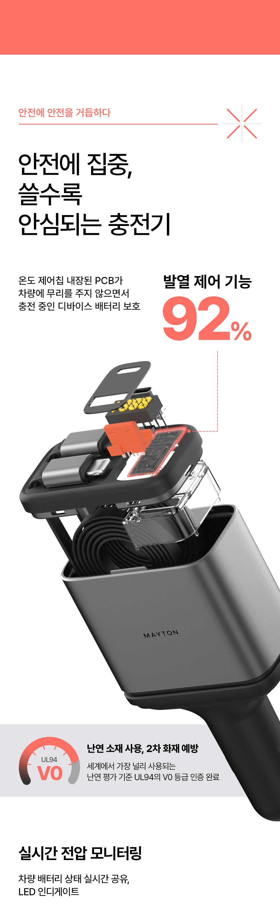 - 난연 소재 사용으로 2차 화재 예방 (난연 평가 기준 UL94의 V0등급 인증 완료)