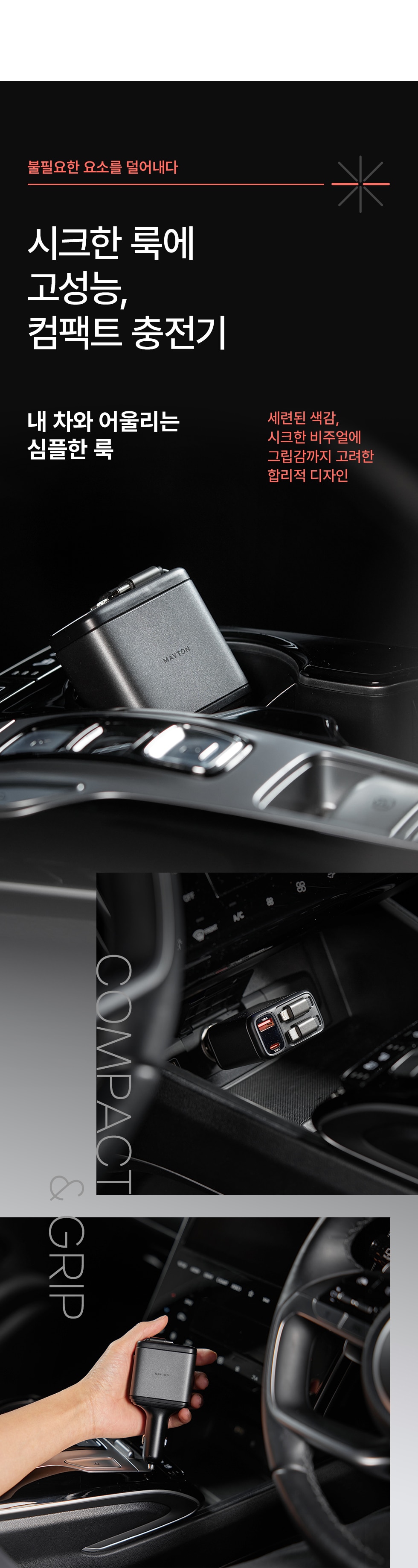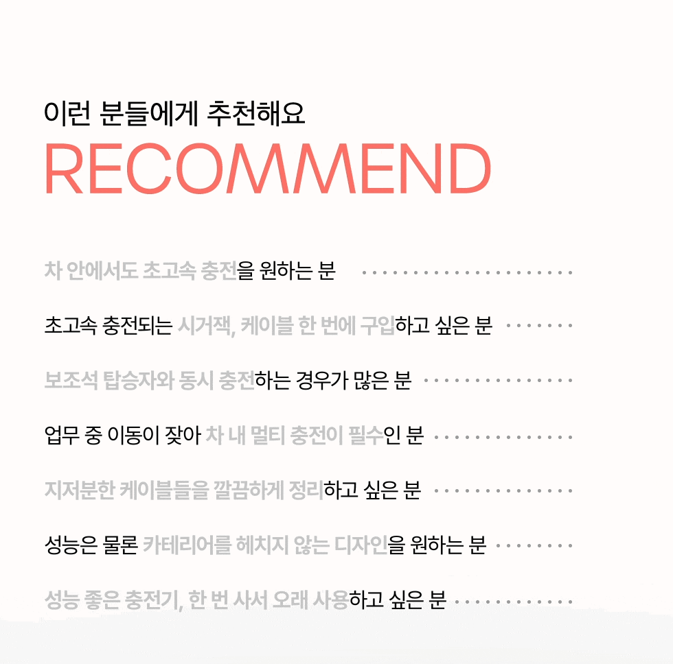| 취급 방법 및 취급 시 주의사항 | 사용 시 주의 사항 본 제품은 12V~24V 전압에서 사용 가능하며, 해당 전압의 차량에 적합한 점 참고하십시오. 10V 미만(최소값) 또는 28V를 초과하는 전압에서는 사용할 수 없으며, 사용 시 제품에 손상이 발생할 수 있는점 참고하십시오. 사용 전 충전기 사양이 기기와 호환되는지 확인하십시오. 총 전력 소비가 제품의 정격 출력을 초과하지 않도록 하십시오. 차량 시동이 켜진 후 제품을 연결하십시오. 충전 완료 후 충전 케이블을 기기에서 제거하십시오. 최상의 충전을 위해 인증된 케이블을 사용하십시오. 충전 규격 지원 안내 Type-C 케이블: QC3.0 / QC2.0 / AFC / FCP / PD3.0 / PD2.0 / PPS 8핀 라이트닝 케이블: PD3.0 / PD2.0 USB-A 포트: QC3.0 / QC2.0 / AFC / FCP / SCP Type-C 포트: QC3.0 / QC2.0 / AFC / FCP / PD3.0 / PD2.0 |