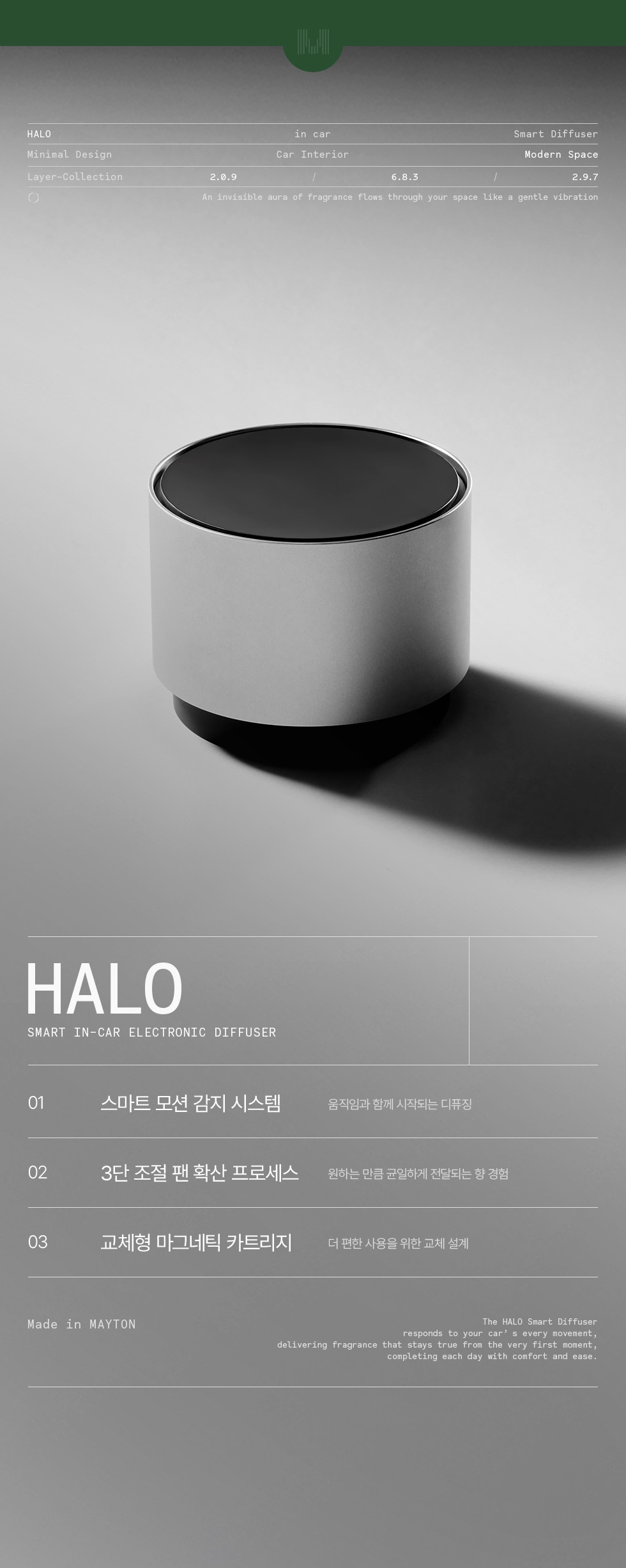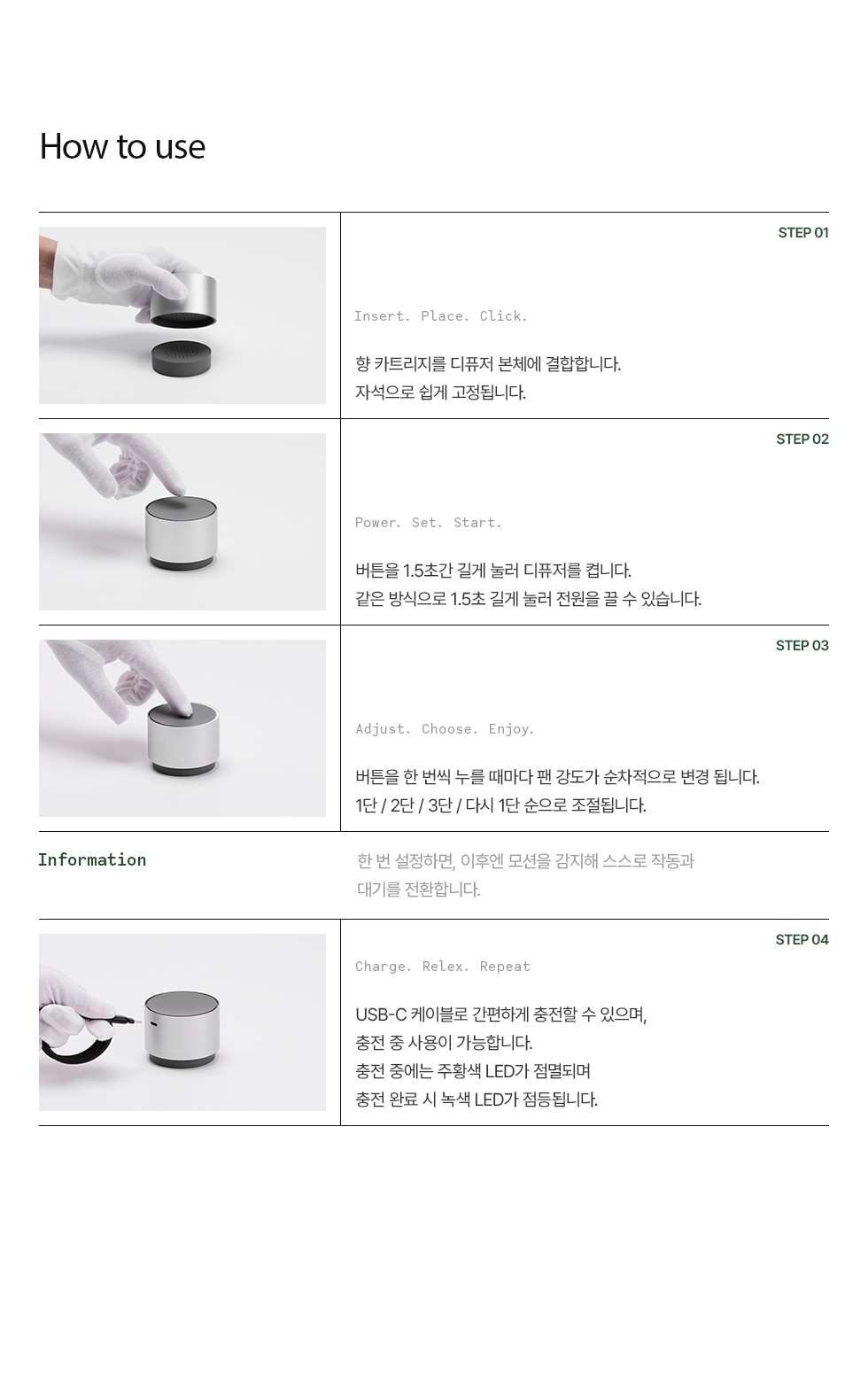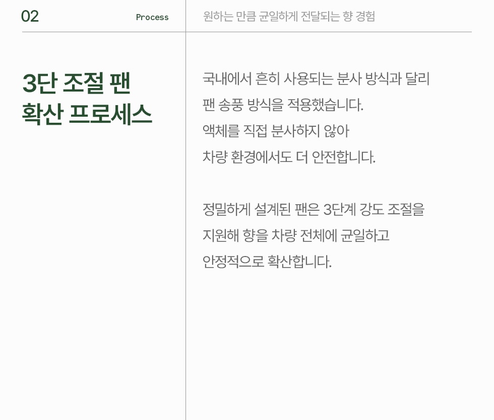 - 3단 조절 팬 확산 프로세스 (원하는 만큼 균일하게 전달되는 향 경험)