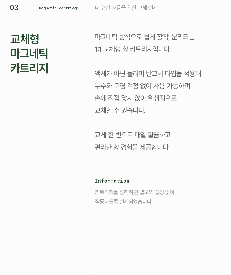 - 교체형 마그네틱 카트리지 (누수와 오염 걱정 없이 사용 가능)