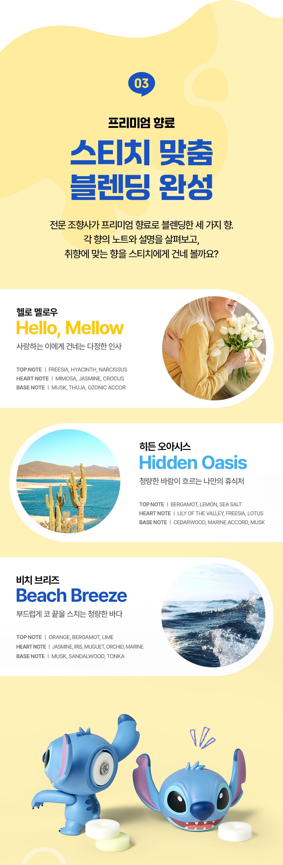 - 향 종류 : 비치 브리즈향, 헬로 맬로우향, 히든 오아시스향