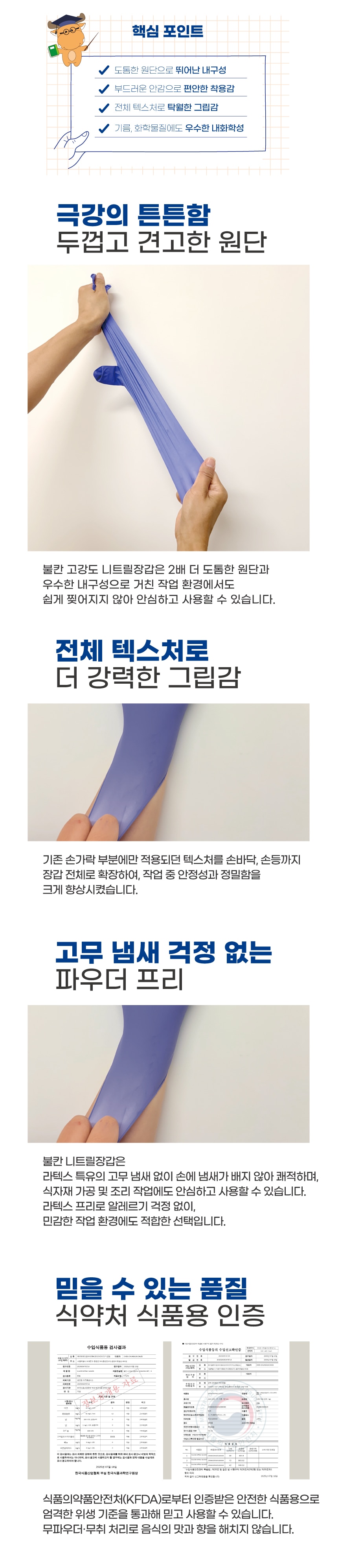 취급 방법 및 취급 시 주의사항 | 착용 시 무리하게 잡아당길 경우 찢어짐의 원인이 될 수 있습니다. 일회용 위생장갑으로, 위생을 위해 재사용을 하지 않습니다. 화기에 가까이 두지 마십시오. 칼이나 송곳 등 날카로운 물건에 구멍이 나지 않도록 주의하십시오. 손에 물기를 제거한 후 사용하십시오. 위생적인 사용 및 성능의 유지를 위해, 한번 사용한 제품은 재사용하지 마십시오. 알레르기 반응과 그로 인한 위험을 사전에 인지하고 사용하십시오. 알레르기 반응이 있을 경우 즉시 사용을 중지하고 의사와 상담하십시오 . 영유아의 손에 닿지 않게 보관하십시오. 영유아가 뒤집어쓰지 않도록 주의하십시오. 본 장갑은 의료용이 아닙니다. 독성 화학물질에 직접 노출되는 작업, 응용 분야에 사용할 수 없습니다. 섭씨 40도 이상의 고온을 피하고, 서늘하고 건조한 곳에 보관. 개봉된 제품이 직사광선, 형광등에 노출되지 않도록 하십시오. |