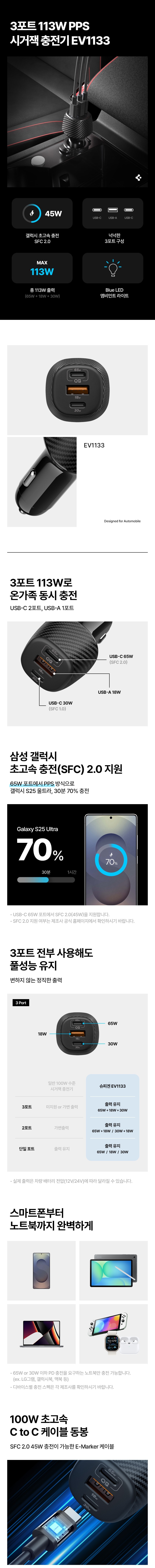 품명 | 슈피겐 113W 갤럭시 초고속 충전 PPS 차량용 3포트 시거잭 충전기 EV1133 |