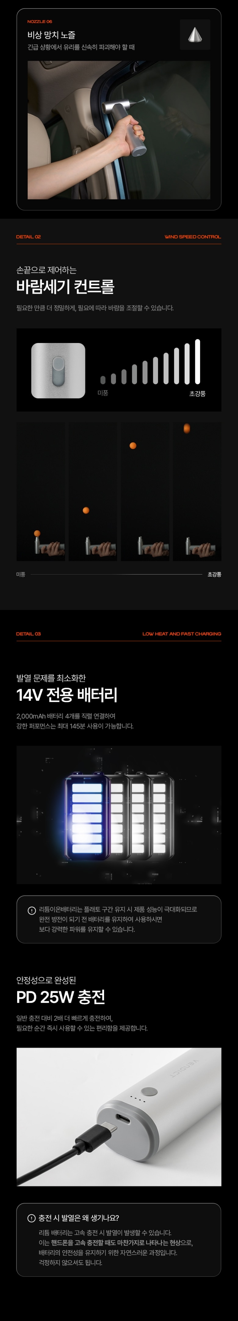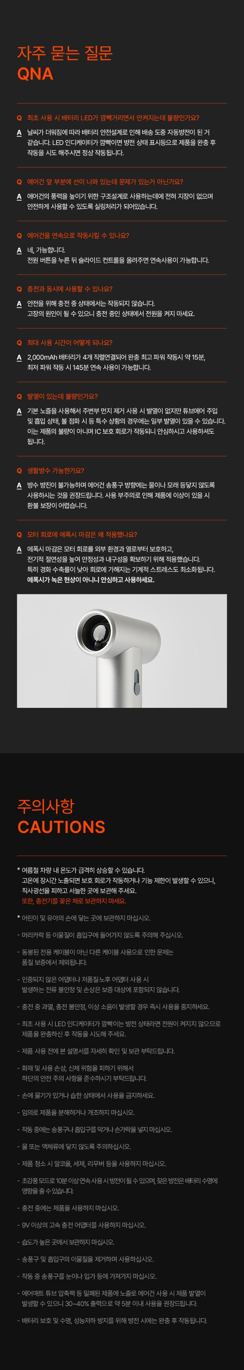 | 취급 방법 및 취급 시 주의사항 | 어린이 및 유아의 손에 닿는 곳에 보관하지 마십시오 손에 물기가 있거나 습한 상태에서 사용을 금지하십시오 작동 중 송푸구나 흡입구를 막거나 손가락을 넣지 마십시오 충전 중에는 제품을 사용하지 마십시오 작동 중 송푸구를 눈이나 입가 등에 가져가지 마십시오 |