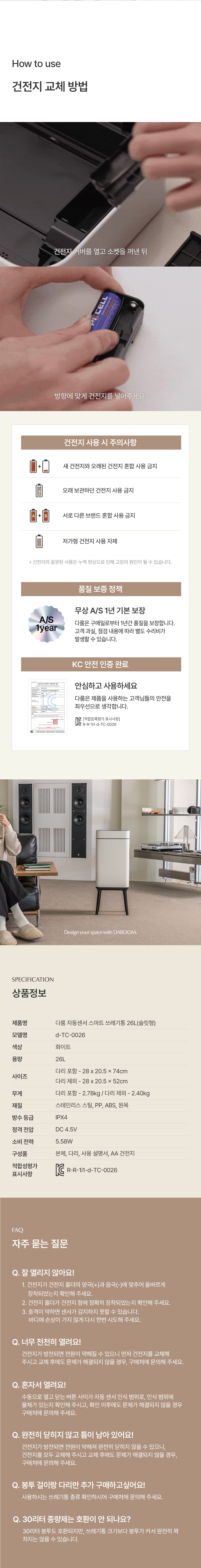 취급 방법 및 취급 시 주의사항 | 본 상품은 뚜껑 안에 전자 센서가 내장되어 있어 물이나 세제로 청소할 경우, 고장의 원인이 될 수 있습니다. 충전식 건전지와 일반 일회용 건전지를 함께 사용하지 마십시오. 건전지가 방전되었을 시 바로 교체하여야 누액을 피할 수 있습니다. 또한 장기간 사용하지 않을 경우 건전지를 본체에서 분리하여 보관해주세요. 제품을 고열에 장시간 노출시키거나 물에 담그지 마십시오. 제품 파손의 원인이 될 수 있습니다. 회로 누출이 발생하는 것을 방지하기 위해 심한 고온, 습도 같은 부식이 되는 환경에서 사용하지 마십시오. 제품을 임의로 분해하지 마십시오. |