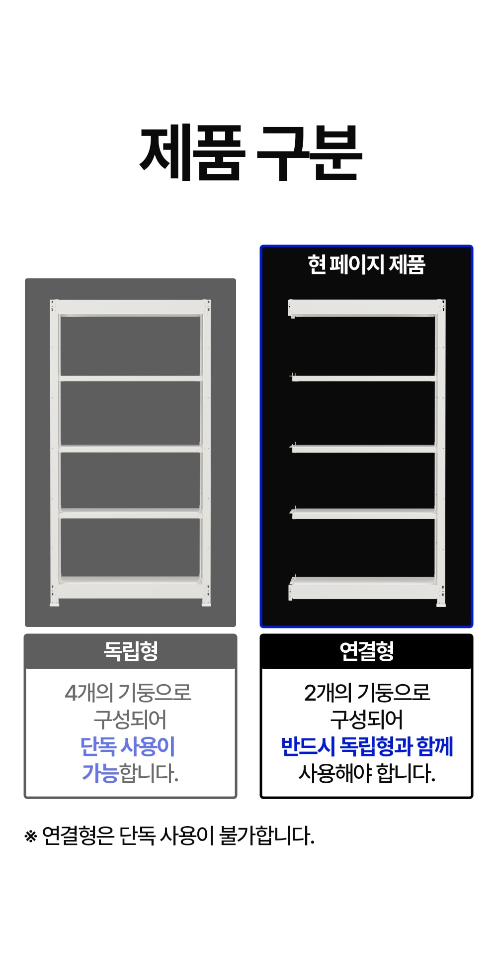 | 취급 방법 및 취급 시 주의사항 | [조립 시 주의 사항] 박스 개봉 후 구성품에 이상이 없는지 확인하십시오. 제품을 조립 할 때 장갑을 사용하고 손가락 끼임, 긁힘 등 안전에 주의하십시오. 제품을 평평하고 안전한 장소에서 조립/사용하십시오. 기둥은 설계된 높이 범위 내에서만 연장해 사용하시기 바라며, 과도한 기둥 연결은 안전을 저하시킬 수 있습니다. (※ 연결형은 단독 사용 불가, 반드시 독립형과 함께 사용해야합니다 ※) (※ 연결형 설치시 독립형과 깊이 사이즈가 동일하게 해주세요 ※) [사용 시 주의 사항] 조립 후 선반이 확실히 고정되었는지 확인한 뒤 사용하십시오. 오래되었거나 손상된 부품은 즉시 교체하여 안전성을 유지하십시오. 제품 위에 올라가거나 매달리는 등 충격이 가해지는 행동은 금물입니다. 제품의 모서리나 돌출 부위에 신체가 닿지 않도록 주의하십시오. 경량랙은 다양한 구성 변경이 가능하지만, 균형을 해치는 임의 변경(부속 제거·기울어진 구조)은 삼가주십시오. [적재 시 주의 사항] 선반별 최대 하중(적재 무게)을 초과하지 않도록 주의하십시오. 제품 전체의 중량 균형이 맞도록 물품을 골고루 적재해 주십시오. 무거운 물건은 항상 하단 선반부터 적재하여 전도 위험을 줄이십시오. [보관 시 주의 사항] 철제 구조 특성상 일반적인 고온 환경에서도 변형이나 내구성 저하가 적어 안정적으로 보관·사용이 가능합니다. 다만, 직접적인 화기 노출 또는 80~90℃ 이상 고열이 장시간 지속되는 환경에서는 금속 열변형 및 도장 손상 가능성이 있으므로 주의하십시오. 고온·저온 반복 환경에서는 금속 수축·팽창으로 인한 미세 흔들림이 발생할 수 있으니 주기적으로 고정 상태를 점검해 주십시오. 습도가 과도하게 높은 공간에서는 표면 부식(녹 발생) 가능성이 있으므로 통풍이 잘되는 장소에 설치·보관하시기 바랍니다. 세척 후에는 수분과 습기를 완전히 제거하여 금속 부식 가능성을 줄여주십시오. 염분이나 화학물질이 직접 닿는 환경에서는 도장면이 손상될 수 있으므로 보호 조치를 권장합니다. |