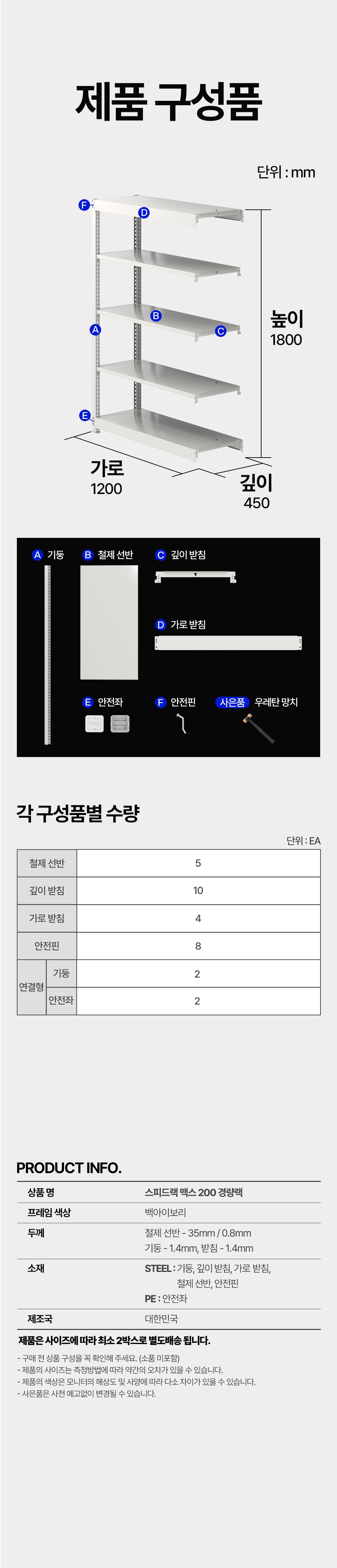 | 구성품 (제품 구성) | 기둥, 철제선반, 깊이받침, 가로받침, 안전좌, 안전핀, 우레탄망치 |