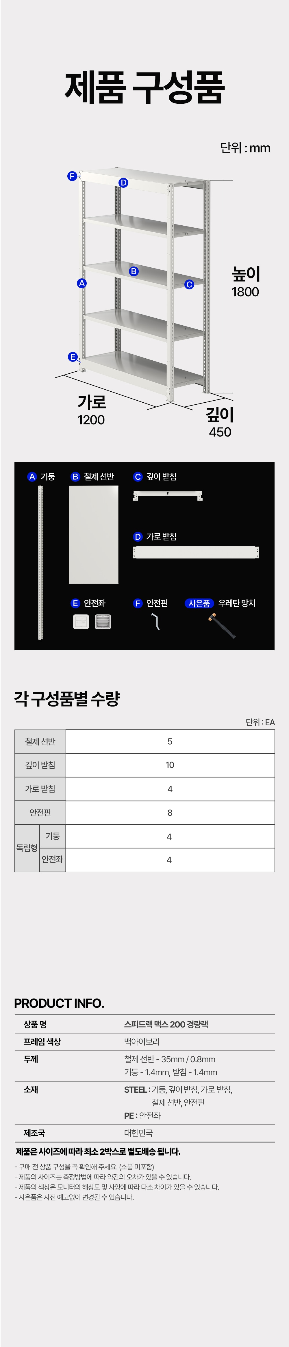 | 구성품 (제품 구성) | 기둥, 철제선반, 깊이받침, 가로받침, 안전좌, 안전핀, 우레탄망치 |