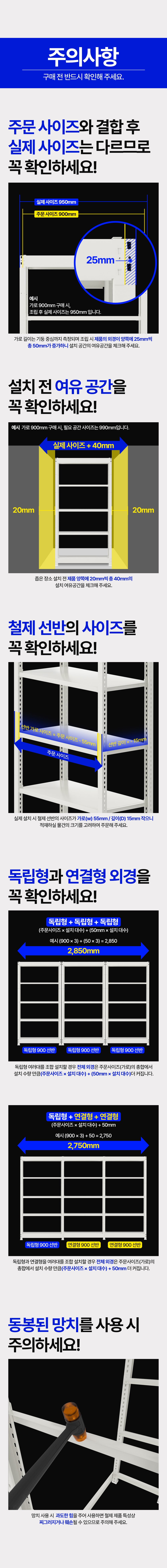 | 취급 방법 및 취급 시 주의사항 | [조립 시 주의 사항] 박스 개봉 후 구성품에 이상이 없는지 확인하십시오. 제품을 조립 할 때 장갑을 사용하고 손가락 끼임, 긁힘 등 안전에 주의하십시오. 제품을 평평하고 안전한 장소에서 조립/사용하십시오. 기둥은 설계된 높이 범위 내에서만 연장해 사용하시기 바라며, 과도한 기둥 연결은 안전을 저하시킬 수 있습니다. (※ 연결형은 단독 사용 불가, 반드시 독립형과 함께 사용해야합니다 ※) (※ 연결형 설치시 독립형과 깊이 사이즈가 동일하게 해주세요 ※) [사용 시 주의 사항] 조립 후 선반이 확실히 고정되었는지 확인한 뒤 사용하십시오. 오래되었거나 손상된 부품은 즉시 교체하여 안전성을 유지하십시오. 제품 위에 올라가거나 매달리는 등 충격이 가해지는 행동은 금물입니다. 제품의 모서리나 돌출 부위에 신체가 닿지 않도록 주의하십시오. 경량랙은 다양한 구성 변경이 가능하지만, 균형을 해치는 임의 변경(부속 제거·기울어진 구조)은 삼가주십시오. [적재 시 주의 사항] 선반별 최대 하중(적재 무게)을 초과하지 않도록 주의하십시오. 제품 전체의 중량 균형이 맞도록 물품을 골고루 적재해 주십시오. 무거운 물건은 항상 하단 선반부터 적재하여 전도 위험을 줄이십시오. [보관 시 주의 사항] 철제 구조 특성상 일반적인 고온 환경에서도 변형이나 내구성 저하가 적어 안정적으로 보관·사용이 가능합니다. 다만, 직접적인 화기 노출 또는 80~90℃ 이상 고열이 장시간 지속되는 환경에서는 금속 열변형 및 도장 손상 가능성이 있으므로 주의하십시오. 고온·저온 반복 환경에서는 금속 수축·팽창으로 인한 미세 흔들림이 발생할 수 있으니 주기적으로 고정 상태를 점검해 주십시오. 습도가 과도하게 높은 공간에서는 표면 부식(녹 발생) 가능성이 있으므로 통풍이 잘되는 장소에 설치·보관하시기 바랍니다. 세척 후에는 수분과 습기를 완전히 제거하여 금속 부식 가능성을 줄여주십시오. 염분이나 화학물질이 직접 닿는 환경에서는 도장면이 손상될 수 있으므로 보호 조치를 권장합니다. |