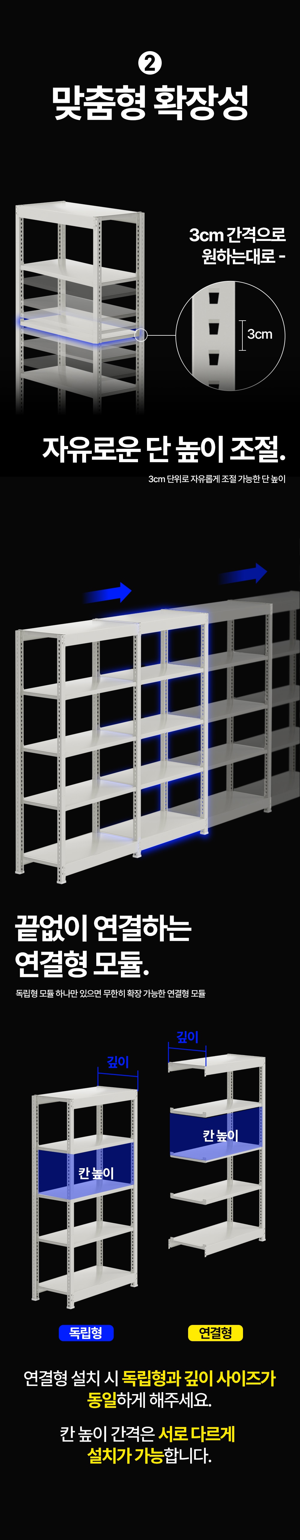 - 3cm 단위 높이 조절로 사용 용도에 맞는 자유로운 확장성과 구성 변경이 가능