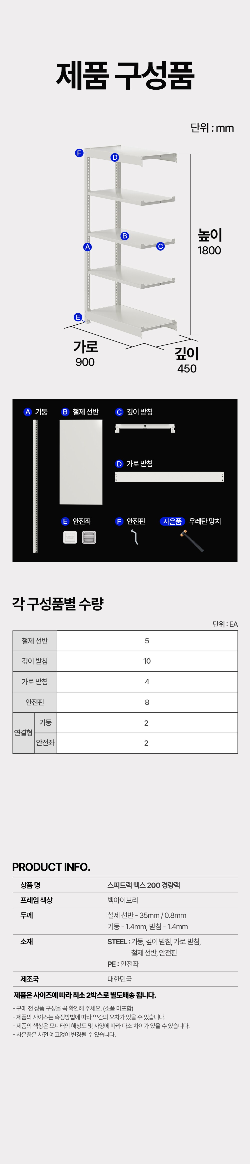 | 구성품 (제품 구성) | 기둥, 철제선반, 깊이받침, 가로받침, 안전좌, 안전핀, 우레탄망치 |