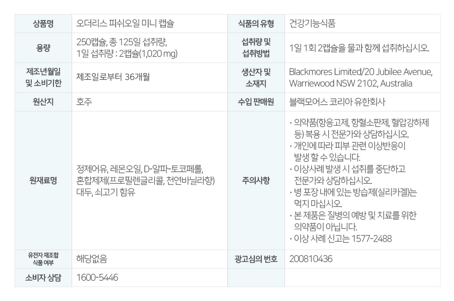 원재료명 및 함량 | 정제어유(멸치), 레몬오일, D-알파 토코페롤, 혼합제제(프로필렌글리콜, 천연바닐라향) 캡슐기제: 젤라틴(우피), 글리세린, 정제수, 바닐린 *대두, 쇠고기 함유 |