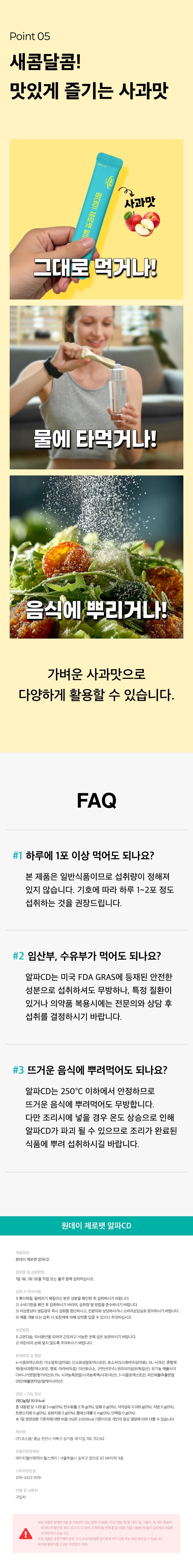 | 원재료명 및 함량 | α-시클로덱스트린, 이소말트(감미료), 난소화성말토덱스트린, 효소처리스테비아(감미료), DL-사과산, 혼합제제(청사과향/덱스트린, 향료, 아라비아검), 이산화규소, 구연산(무수), 귀리식이섬유(독일산), 유기농애플사이다비니거분말(헝가리산)0.1%, 사과농축분말{사과농축액(사과/국산)}, β-시클로덱스트린, 파인애플추출분말(파인애플엔자임/말레이시아산) |