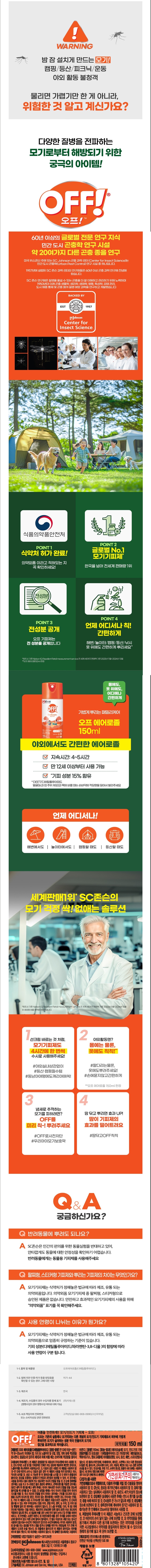 - 오프는 기존 살충제나 모기약과는 다른 개념의 모기/진드기 기피제로서 피부에 가볍게 뿌려주면 모기가 싫어하는 성분 막이 만들어져 모기의 접근을 효과적으로 막아줍니다.