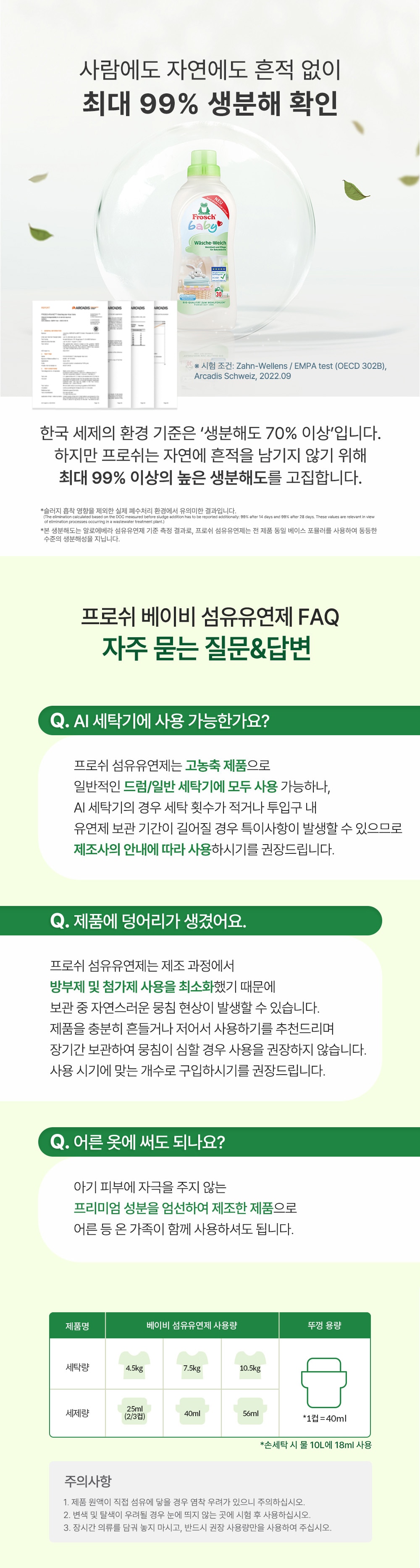 - 식물성 계면활성제, 저자극 성분으로 섬유를 부드럽게 완화시키고 구김을 방지합니다.