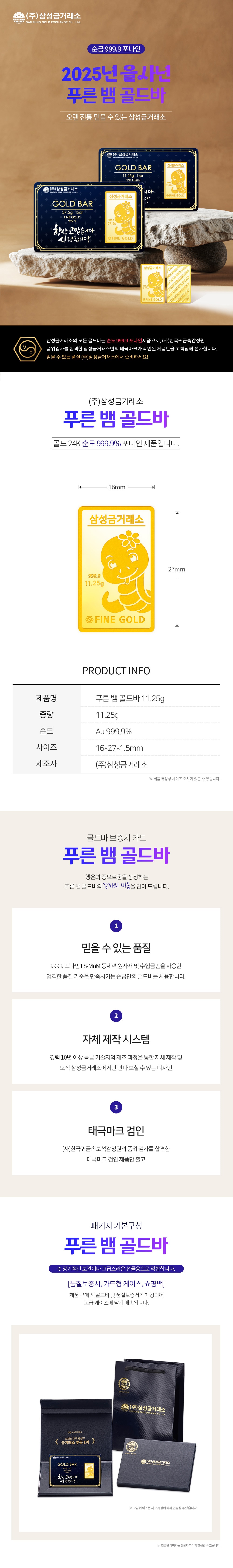 • 푸른 뱀의 해 을사년을 기념하여 행운과 풍요로움을 상징하는 푸른 뱀의 이미지가 각인된 골드바로 뜻깊은 선물하세요.