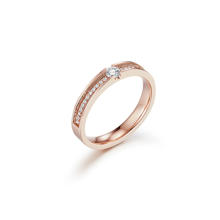- 부드러운 핑크 골드 컬러로 우아하고 따뜻한 무드를 완성하는 웨딩밴드 여성 반지입니다.