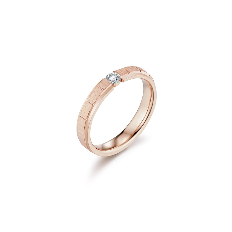 - 중앙에 세팅된 다이아몬드가 단단한 사랑의 중심을 상징하며, 겉면의 수직 컷팅은 함께 걷는 시간을 의미합니다.