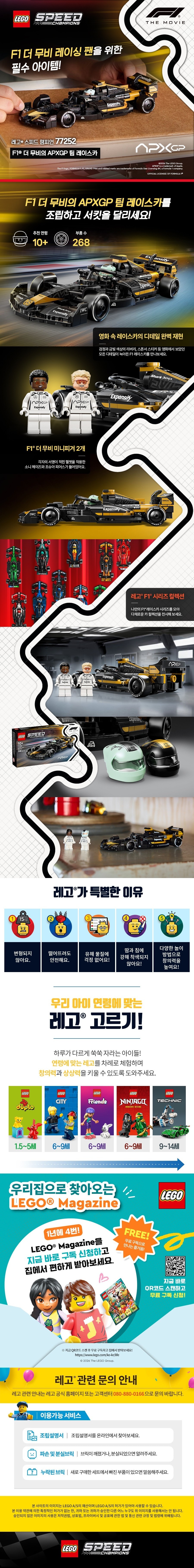 - F1 더 무비 장난감 자동차 – 10세 이상 남녀 공용의 레고 스피드 챔피언 F1 더 무비의 APXGP 팀 레이스카 모델 자동차 키트(77252)와 함께 조립과 전시를 즐기고 영화 속의 장면들을 재현해보아요