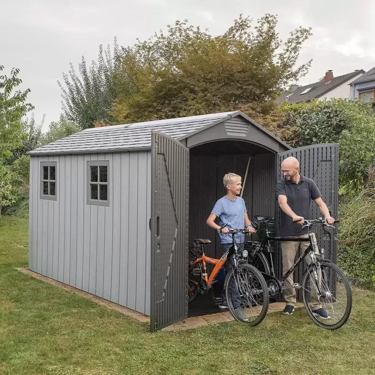 라이프타임 7x12 야외용 조립식 창고는 UV코팅 처리된 HDPE(High-Density Polyethylene) 플라스틱과 파우더 코팅 스틸로 제작되어 내구성이 매우 뛰어납니다. 얼룩이 잘 남지 않으며 충격에 강한 폴리에틸렌 바닥은 관리가 거의 필요하지 않고, 외부는 정원용 호스로 물을 뿌려 정기적으로 청소해 주기만 하면 됩니다. 이 창고는 나무나 콘크리트로 기초를 닦은 평평한 바닥에 설치하셔야 합니다. 바닥에 구멍을 뚫고 기초작업시 고정할 수 있도록 바닥 각 코너에 고정용 장비를 장착할 수 있도록 약간 들어간 부분이 있습니다. 고정용 장비는 준비된 기초 작업에 따라 달라지기 때문에 본 창고 키트에 포함되어 있지 않습니다. 기초 설치를 제외한 창고 조립에는 성인 세 명 이상이 설치하도록 권장합니다.