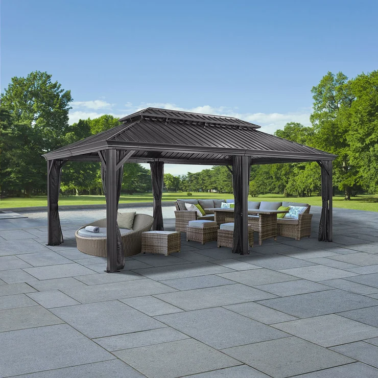 Messina Sun Shelter로 야외 생활 공간을 개선하십시오. 더운 여름날 수영장 옆에서 휴식을 취할 수 있는 그늘진 공간은 물론 친구와 가족이 모여 식사를 즐길 수 있는 안식처 이기도 합니다. 내구성있는 아연 도금 강철 지붕과 고품질 분말 코팅 알루미늄 프레임으로 새로운 야외 생활 경험을 느껴보세요. PVC 코팅 폴리 에스테르 메쉬로 만든 모기장 한 세트가 포함되어 있어 내구성이 매우 뛰어나고 바람과 태양 노출을 줄여줍니다.