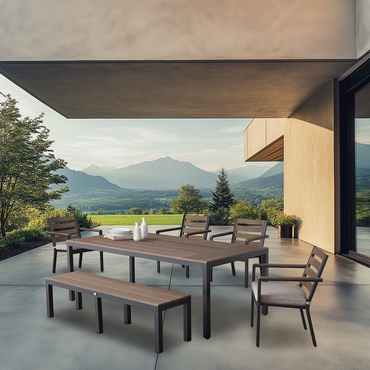 - 다이닝 테이블과 벤치는 깔끔한 라인과 따뜻한 나무와 같은 톤을 보여주며, 내구성을 위해 매끄러운 분말 코팅 알루미늄 프레임과 짝을 이루었습니다.
