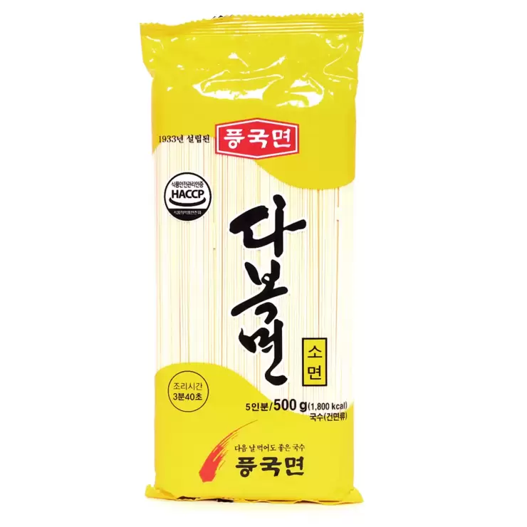 풍국면 다복면은 진공 숙성 방식을 통해 면이 보다 단단해지도록 하였으며, 조리 후에도 일반 소면보다 찰지고 쫄깃한 식감을 제공합니다