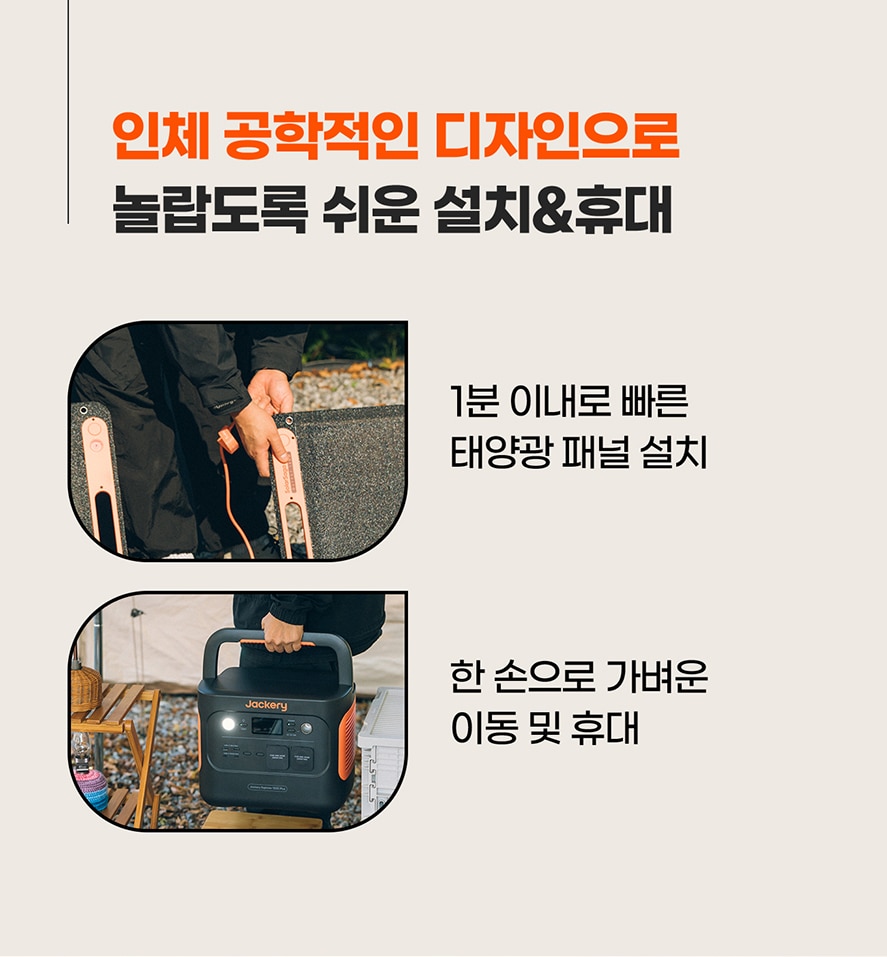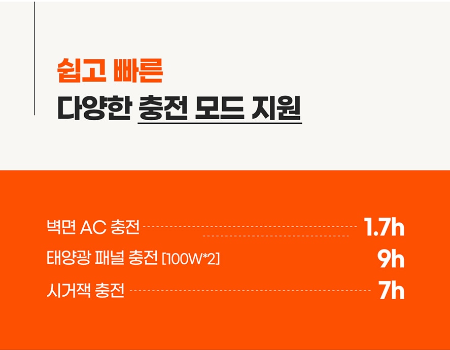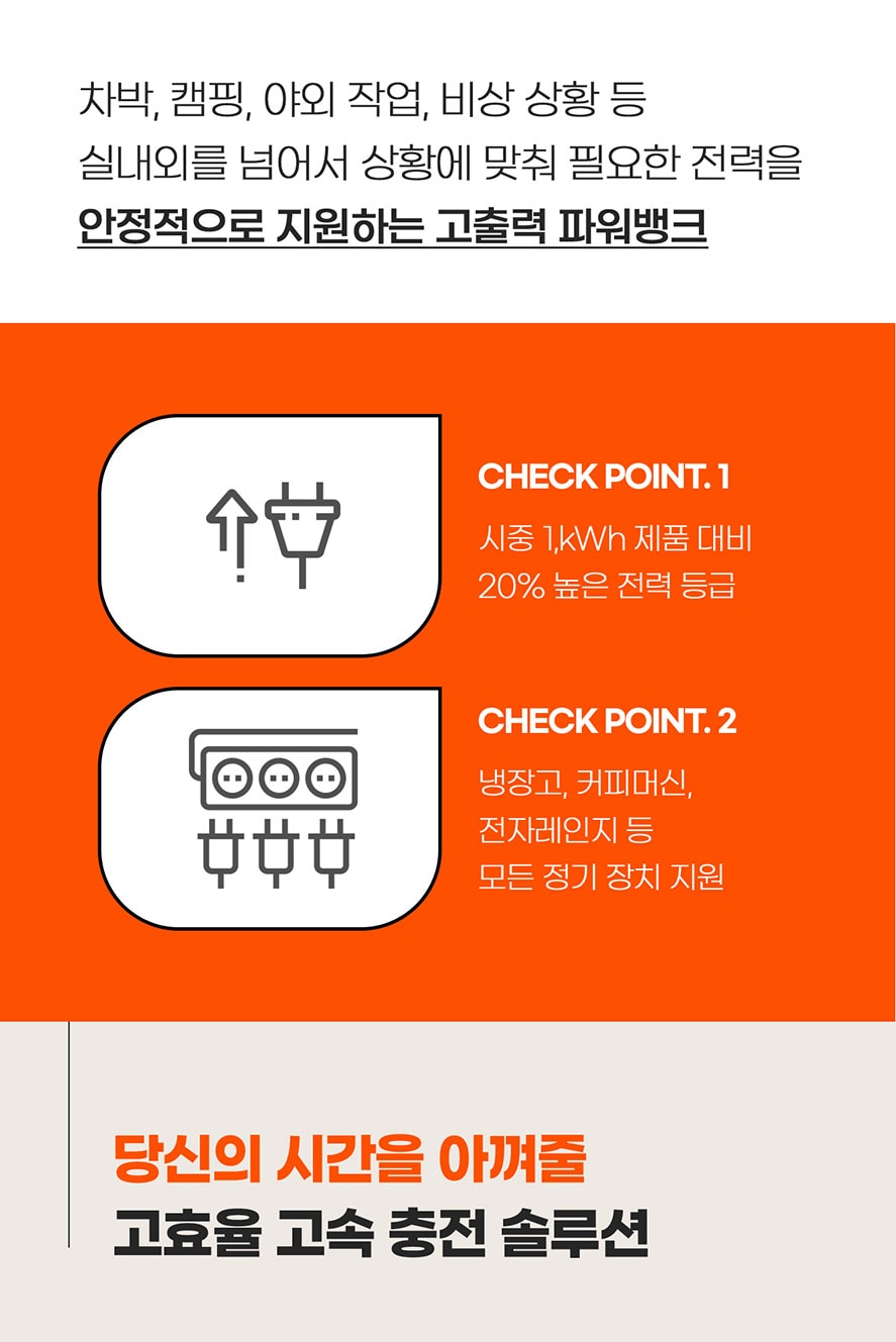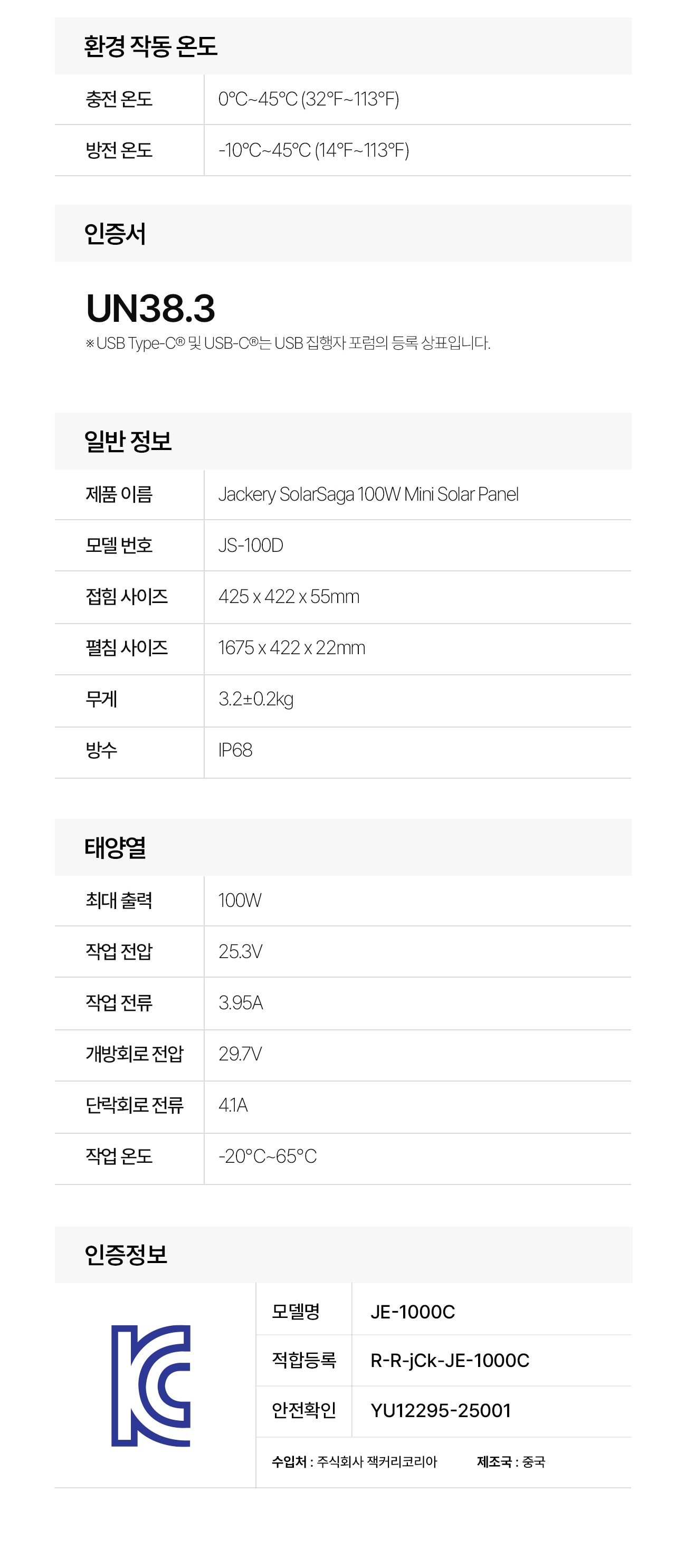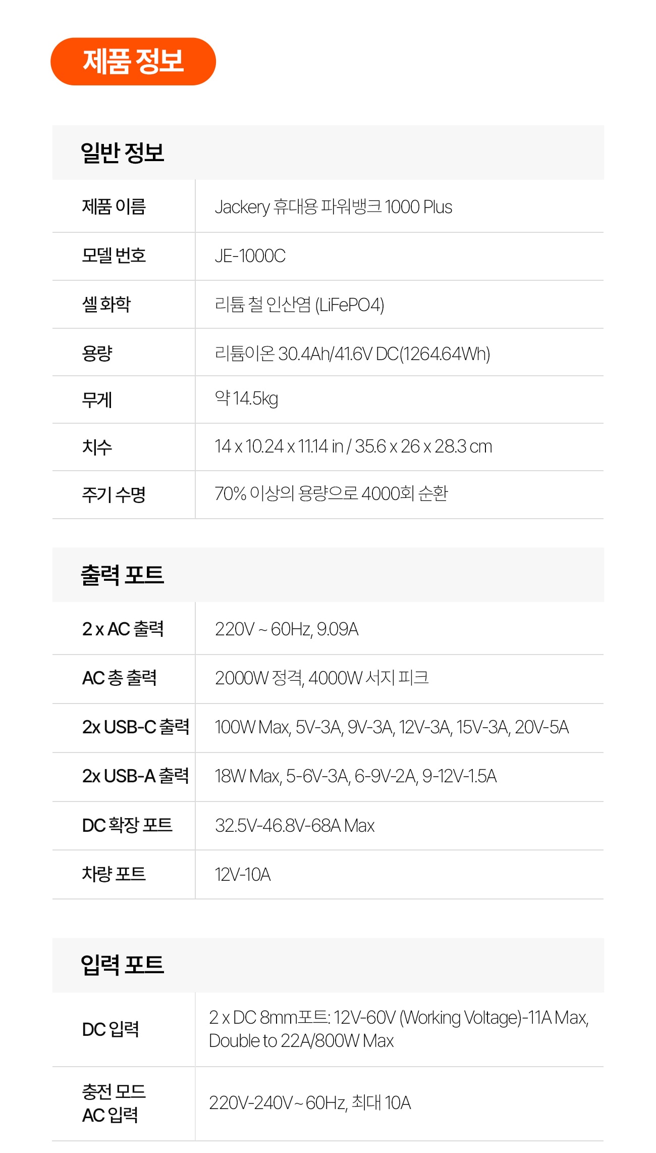 | 구성품 (제품 구성) | 파워뱅크, 태양광 패널, 차량용 충전 케이블, AC 충전 케이블, 메뉴얼, 엑세서리 팩 |