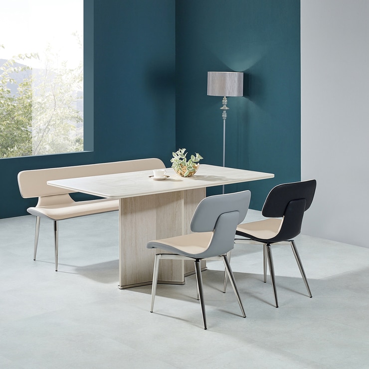 | 색상 | 식탁 프레임: 베이지 샤르데니아, 스테인레스 / 세라믹상판: 베이지 샤르데니아 / 의자 방석: 아이보리 / 의자 등받이 뒷면 색상: 블랙, 그레이 / 벤치 방석: 아이보리 / 벤치 등받이 뒷면 색상: 그레이 |