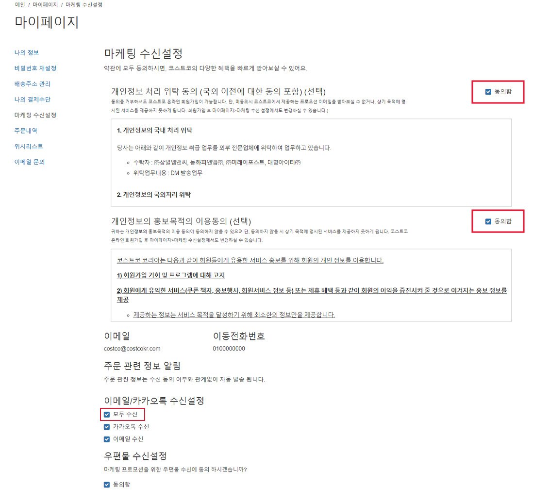 코스트코 온라인몰에서 이벤트 기간 내에 신규 마케팅 이메일/카카오톡 모두 수신동의한 회원님